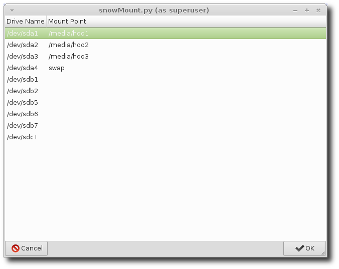 snowMount is a Snowlinux mount tool for drives. You can give a drive a mount point, which will be created automatically, and mount a drive to this mount point.